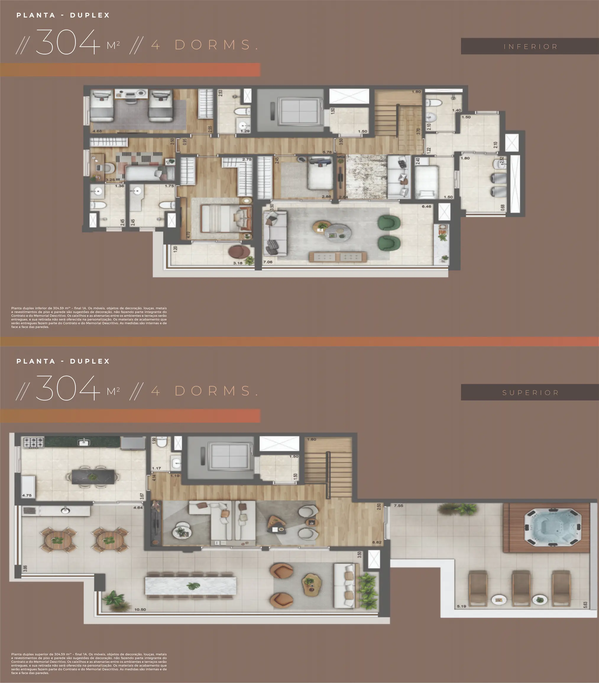 | 304m² (Duplex) | 2 Suítes + 2 Dormitórios | 3 Vagas |