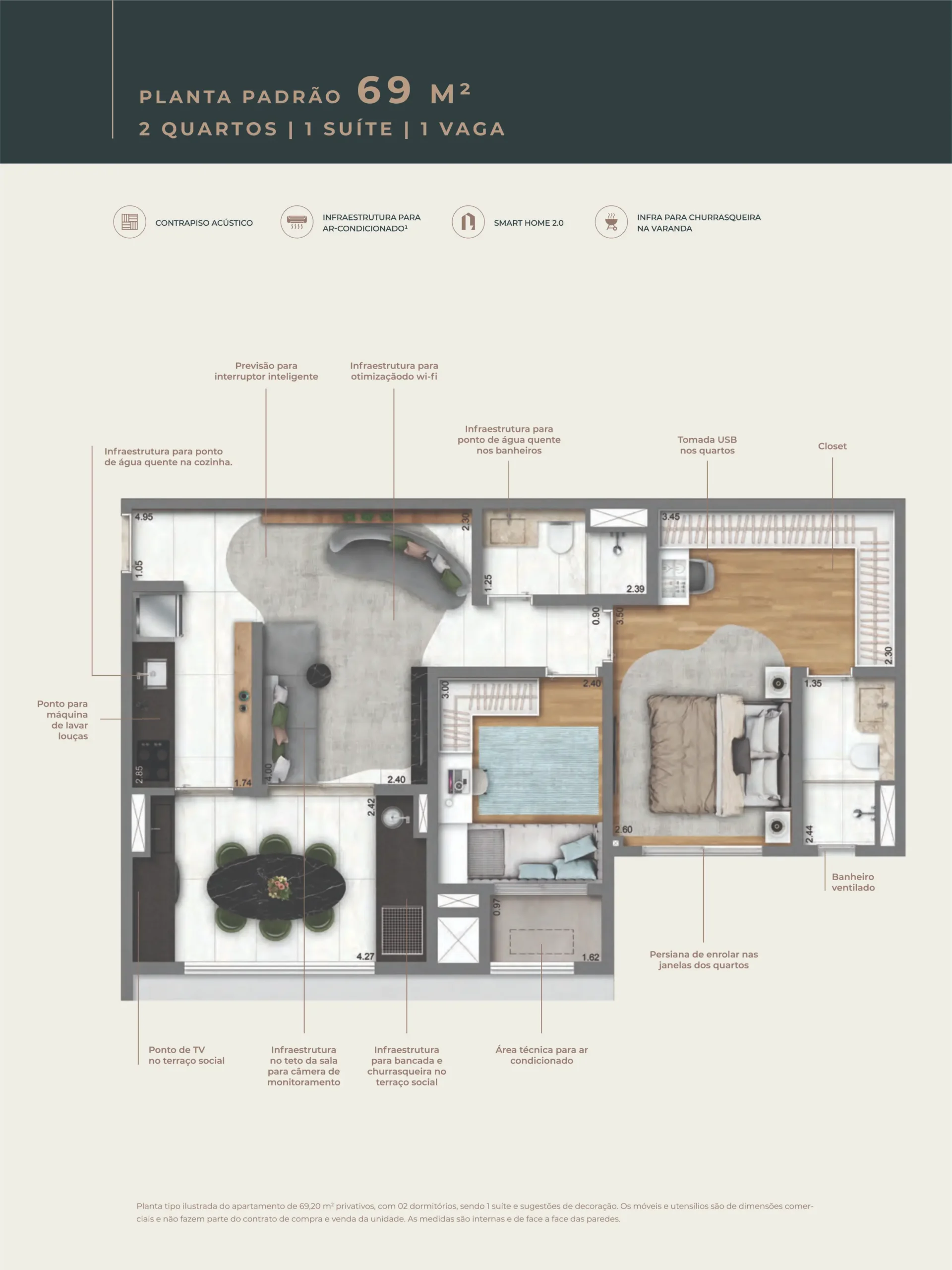 | 69m² | 1 Suíte + 1 Dormitório | 1 Vaga |
