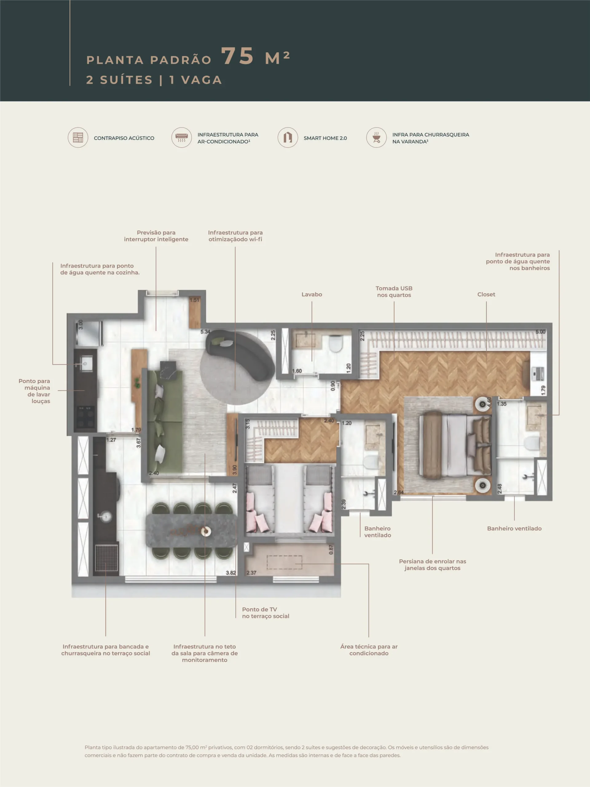 | 75m² | 2 Suítes | 1 Vaga |