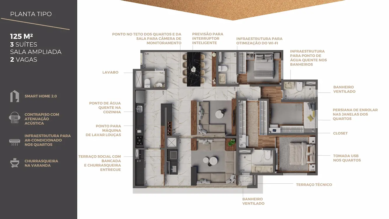 | 125m² | 3 Suítes (sala ampliada) | 2 Vagas |