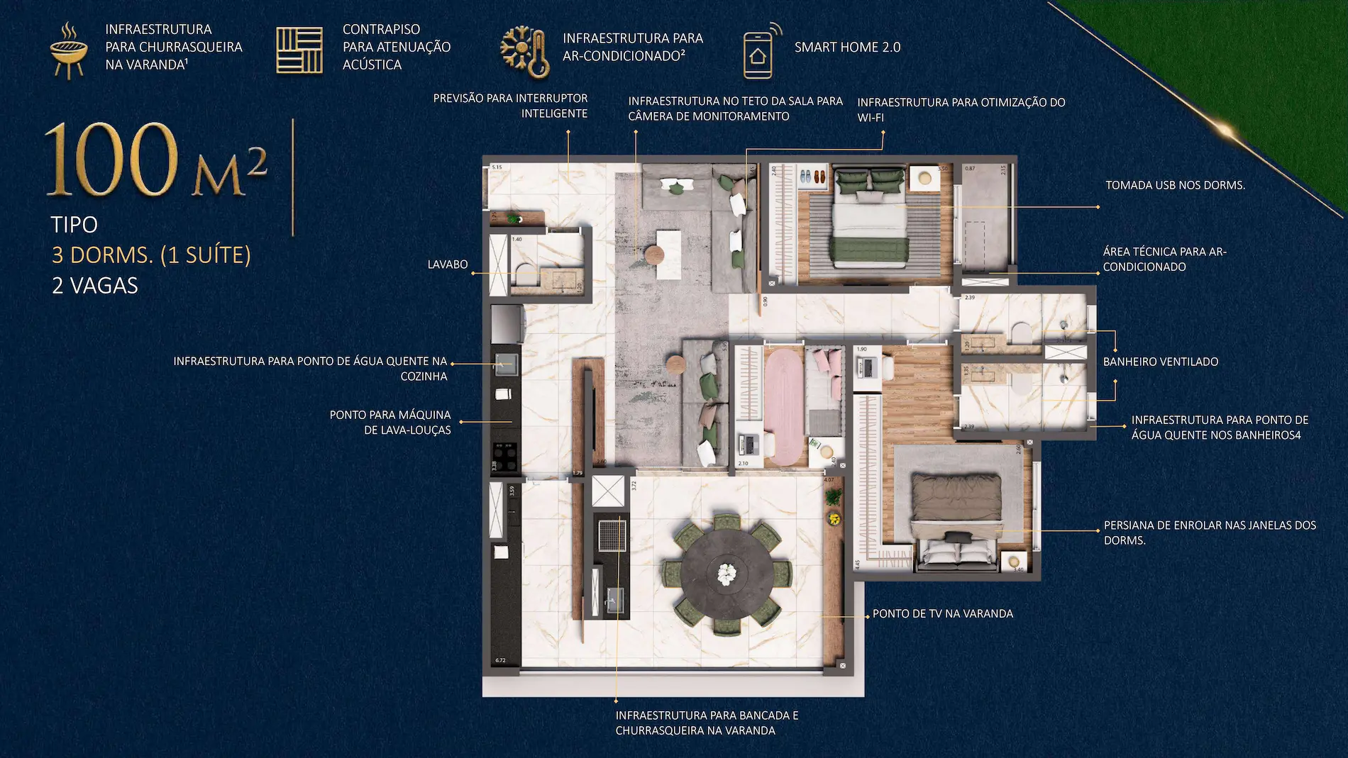 | 100 m² | 1 Suíte + 2 Dormitórios | 2 vagas gaveta e determinadas |