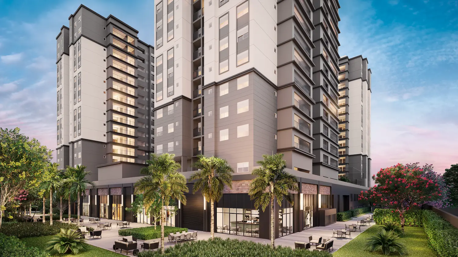 A parte residencial é composta por três torres com 15 pavimentos, cada uma com seis unidades por andar distribuídas em três plantas generosas: 75m², 100m² e 123m². Um diferencial importante do projeto é que todas as unidades contam com um depósito privativo localizado em áreas comuns, com regras de uso a serem definidas pelo condomínio.